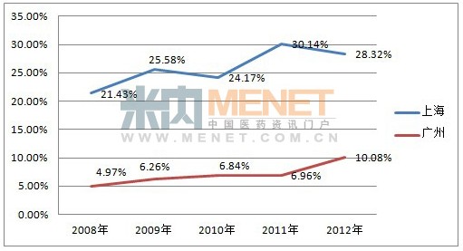 长春瑞滨是植物成分类的抗肿瘤药,主要作用是与微管蛋白结合,使细胞在有丝分裂过程中微管形成障碍,当其浓度>12nmol时可阻断细胞的G2至M期。长春瑞滨主要用于非小细胞肺癌、乳腺癌、卵巢癌、淋巴瘤等。因其主要由胆道排出,肾功能异常的患者也可用此药。本次入选广东基药增补目录的长春瑞滨涉及的企业最多。从城市竞争格局来看,最近几年此类药物用药最多的城市是上海,所占的市场份额均超过20%。广州作为广东省的代表城市,长春瑞滨的销售量逐年上涨,并从2008年的第六位一跃成为了2012年销售量第二大的城市。