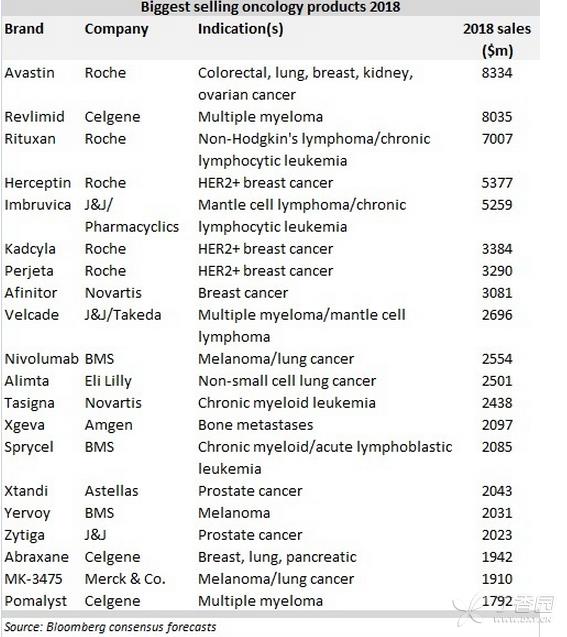 2013年,制药行业20款最畅销癌症药物总共产生530亿美元的销售额,罗氏美罗华(利妥昔单抗)、阿瓦斯汀和赫赛汀将继续扩大它们在排行榜中的领先地位。这三款药物的销售额总计约有210亿美元,约占TOP20癌症药物销售总额的大约40%。如果把特罗凯和希罗达也考虑在内,那么这一名单中的罗氏产品在2013年销售了大约240亿美元。
